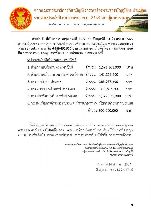สำหรับการประชุมในวันนี้เป็นการประชุมครั้งที่ 15/2565 ซึ่งคณะ กมธ. จะพิจารณางบประมาณในภาพรวมของกระทรวงพาณิชย์ และหน่วยงานในสังกัด 5 หน่วยงาน 1 กองทุน จากทั้งหมด 11 หน่วยงาน 2 กองทุน