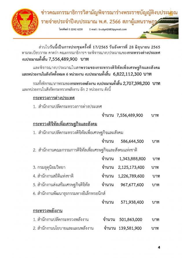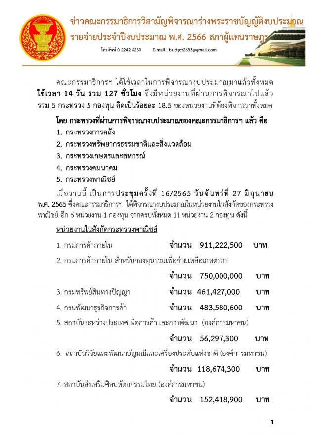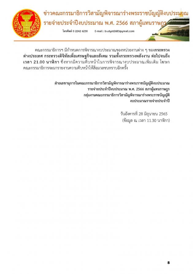 วันอังคารที่ 28 มิถุนายน 2565 เวลา 11.05 นาฬิกา ณ ห้องแถลงข่าว ชั้น 1 อาคารรัฐสภา นายสัณหพจน์ สุขศรีเมือง และนายเรืองไกร ลีกิจวัฒนะ โฆษกคณะ กมธ. วิสามัญพิจารณาร่าง พ.ร.บ.งบประมาณรายจ่ายประจำปีงบประมาณ พ.ศ. 2566 แถลงข่าวความคืบหน้าการพิจารณาของคณะ กมธ. ว่า คณะ กมธ. ใช้เวลาในการพิจารณางบประมาณมาแล้วทั้งหมด 14 วัน รวม 127 ชั่วโมง ซึ่งมีหน่วยงานที่ผ่านการพิจารณาไปแล้ว 5 กระทรวง 5 กองทุน คิดเป็นร้อยละ 18.5 ของหน่วยงานที่ต้องพิจารณาทั้งหมด โดย กระทรวงที่ผ่านการพิจารณางบประมาณของคณะ กมธ. แล้ว คือ 1. กระทรวงการคลัง 2. กระทรวงทรัพยากรธรรมชาติและสิ่งแวดล้อม 3. กระทรวงเกษตรและสหกรณ์ 4. กระทรวงคมนาคม และ 5. กระทรวงพาณิชย์