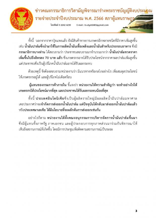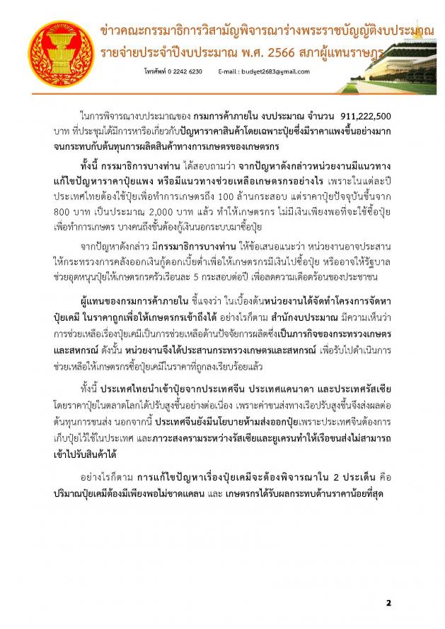 โดย เมื่อวานนี้ (27 มิ.ย. 65) เป็นการประชุมครั้งที่ 16/2565 ซึ่งคณะ กมธ. ได้พิจารณางบประมาณหน่วยงานในสังกัดของกระทรวงพาณิชย์ อีก 6 หน่วยงาน 1 กองทุน จากทั้งหมด 11 หน่วยงาน 2 กองทุน ส่วนในวันนี้(28 มิ.ย. 65) เป็นการประชุมครั้งที่ 17/2565 คณะ กมธ. จะพิจารณางบประมาณของกระทรวงการต่างประเทศ และงบประมาณในภาพรวมของกระทรวงดิจิทัลเพื่อเศรษฐกิจและสังคม และหน่วยงานในสังกัดทั้งหมด 6 หน่วยงานรวมทั้งภาพรวมของกระทรวงพลังงาน และหน่วยงานในสังกัดกระทรวงพลังงาน อีก 2 หน่วยงานสำหรับการพิจารณางบประมาณของ กรมการค้าภายใน ที่ประชุมได้มีการหารือเกี่ยวกับปัญหาราคาสินค้าโดยเฉพาะปุ๋ยซึ่งมีราคาแพงขึ้นอย่างมาก จนกระทบกับต้นทุนการผลิตสินค้าทางการเกษตรของเกษตรกร ซึ่งการแก้ไขปัญหาดังกล่าวต้องพิจารณาใน 2 ประเด็น คือ ปริมาณปุ๋ยเคมีต้องมีเพียงพอไม่ขาดแคลน และเกษตรกรได้รับผลกระทบด้านราคาน้อยที่สุด ทั้งนี้ นอกจากราคาปุ๋ยแพงแล้ว ยังมีสินค้าทางการเกษตรอีกหลายชนิดที่มีราคาเพิ่มสูงขึ้น เช่น น้ำมันปาล์มซึ่งนำมาใช้ในการผลิตน้ำมันเชื้อเพลิงและน้ำมันสาหรับประกอบอาหาร โดยกรมการค้าภายในได้ตั้งคณะอนุกรรมการบริหารจัดการน้ำมันปาล์มขึ้นมา ซึ่งมีผู้แทนทั้งภาครัฐ ภาคเอกชน และผู้ประกอบการทุกภาคส่วนมาร่วมกันพิจารณาให้เห็นถึงสถานการณ์ที่เกิดขึ้น โดยมีการประชุมเพื่อติดตามสถานการณ์เป็นระยะ
