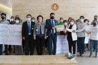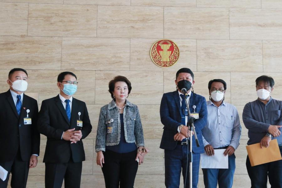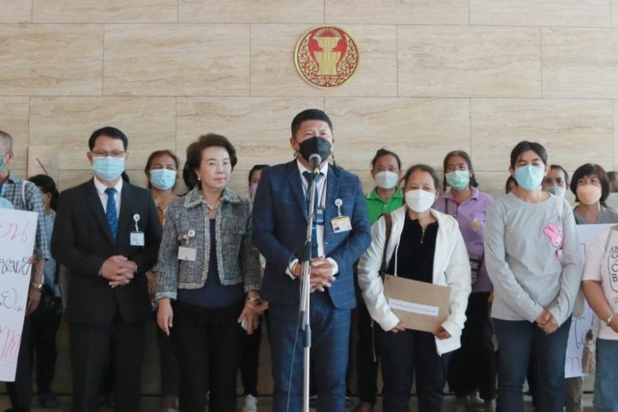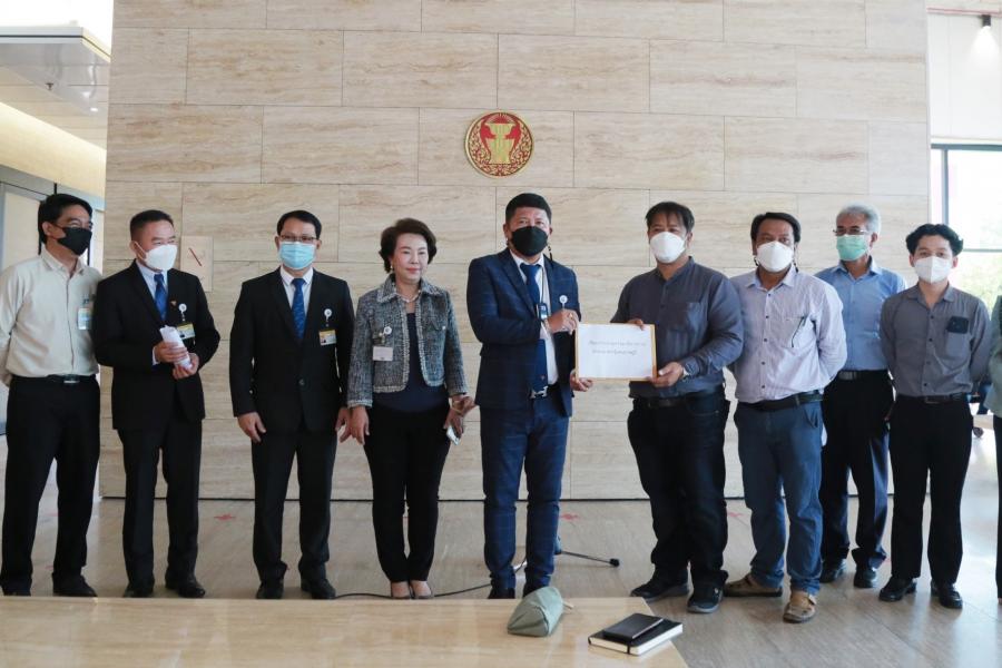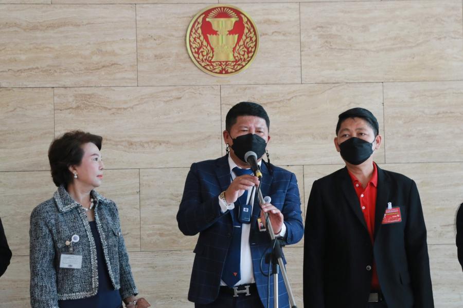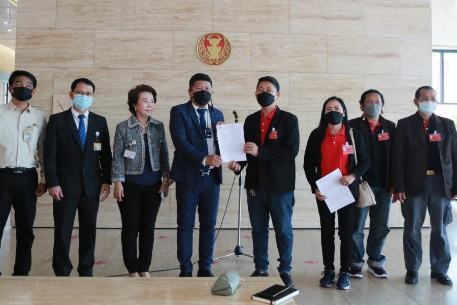 นายสุเทพ อู่อ้น ประธานคณะ กมธ.การแรงงาน พร้อมด้วย นายจรัส คุ้มไข่น้ำ เลขานุการคณะ กมธ. นายทวีศักดิ์ ทักษิณ โฆษกคณะ กมธ. และนางอมรัตน์ โชคปมิตต์กุล ส.ส.พรรคก้าวไกล รับยื่นหนังสือจากผู้ร้องเรียน