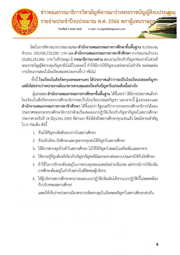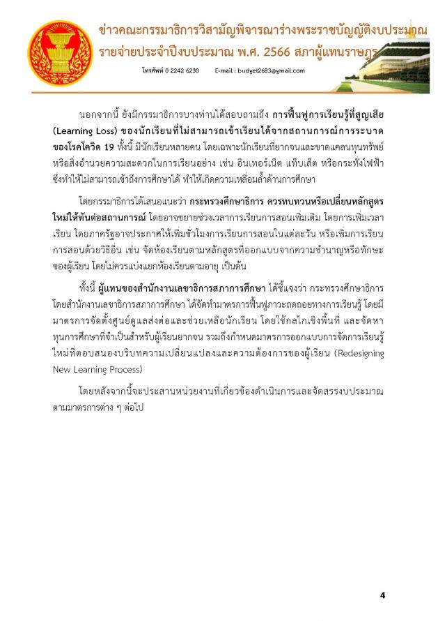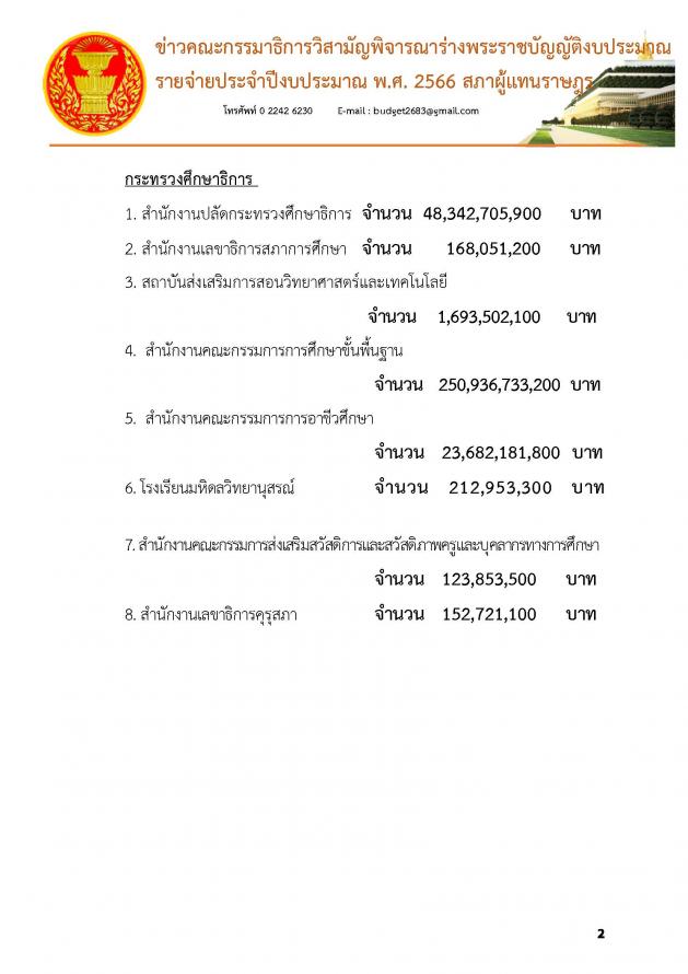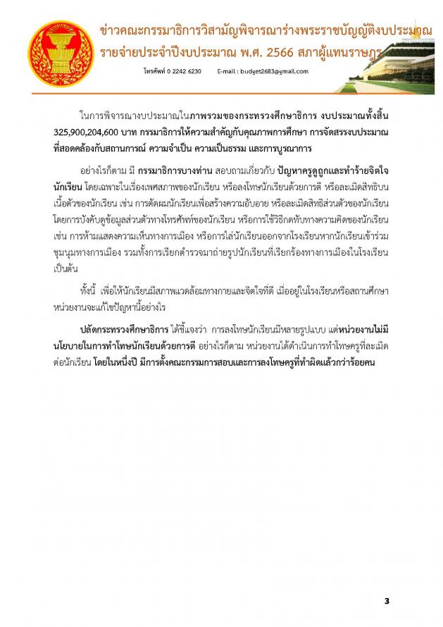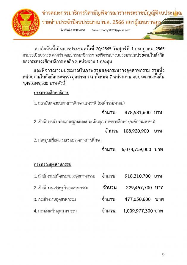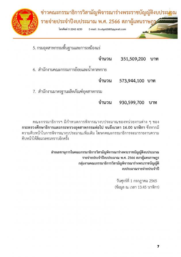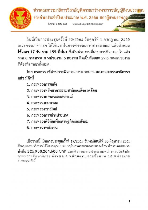 วันศุกร์ที่ 1 กรกฎาคม 2565 เวลา 13.45 นาฬิกา ณ ห้องแถลงข่าว ชั้น 1 อาคารรัฐสภา นายบัญญัติ เจตนจันทร์ พร้อมด้วย นายเรืองไกร ลีกิจวัฒนะ โฆษกคณะ กมธ.วิสามัญพิจารณาร่าง พ.ร.บ.งบประมาณรายจ่ายประจำปีงบประมาณ พ.ศ. 2566 แถลงข่าวว่า วันนี้ (1 ก.ค.65) เป็นการประชุมครั้งที่ 20/2565 คณะกมธ.ได้ใช้เวลาในการพิจารณางบประมาณมาแล้วทั้งหมด 17 วัน รวม 155 ชั่วโมง ซึ่งมีหน่วยงานที่ผ่านการพิจารณาไปแล้วรวม 8 กระทรวง 8 หน่วยงาน 5 กองทุน คิดเป็นร้อยละ 29.6 ของหน่วยงานที่ต้องพิจารณาทั้งหมด โดย กระทรวงที่ผ่านการพิจารณางบประมาณของคณะกมธ.แล้ว มีดังนี้ 1. กระทรวงการคลัง 2. กระทรวงทรัพยากรธรรมชาติและสิ่งแวดล้อม 3. กระทรวงเกษตรและสหกรณ์ 4. กระทรวงคมนาคม 5. กระทรวงพาณิชย์ 6. กระทรวงการต่างประเทศ 7. กระทรวงดิจิทัลเพื่อเศรษฐกิจและสังคม 8. กระทรวงพลังงาน ซึ่งเมื่อวานนี้ (30 มิ.ย. 65) เป็นการประชุมครั้งที่ 19/2565 คณะกมธ.ได้พิจารณางบประมาณในภาพรวมของกระทรวงศึกษาธิการ งบประมาณทั้งสิ้น 325,900,204,600 บาท และพิจารณางบประมาณหน่วยงานในสังกัดกระทรวงศึกษาธิการ ทั้งหมด 8 หน่วยงาน จากทั้งหมด 10 หน่วยงาน 1 กองทุน (รายละเอียดตามเอกสารแนบ)