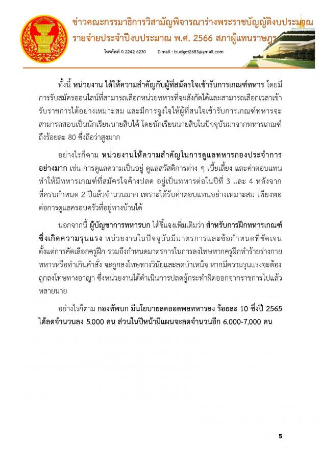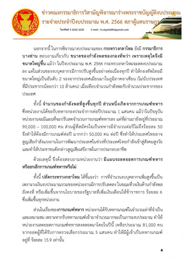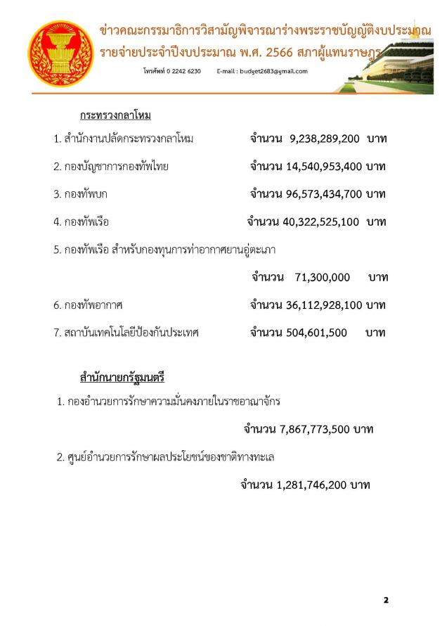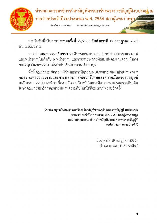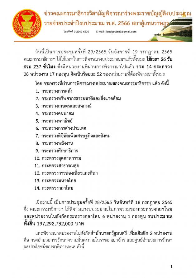 สำหรับการประชุมครั้งที่ 29 เมื่อวานนี้ (19 ก.ค. 65) คณะ กมธ. ได้พิจารณางบประมาณในภาพรวมของกระทรวงแรงงานและหน่วยงานในสังกัดกระทรวงแรงงาน 6 หน่วยงาน งบประมาณทั้งสิ้น 54,338,495,000 บาท และพิจารณาในภาพรวมของกระทรวงการพัฒนาสังคมและความมั่นคงของมนุษย์และหน่วยงานในสังกัดจำนวน 8 หน่วยงาน และ 5 กองทุนงบประมาณทั้งสิ้น 24,626,908,000 บาท และในการประชุมครั้งที่ 28 เมื่อวันจันทร์ที่ 18 ก.ค. 65 คณะ กมธ. ได้พิจารณางบประมาณในภาพรวมของกระทรวงกลาโหมและหน่วยงานในสังกัดกระทรวงกลาโหม 6 หน่วยงาน 1 กองทุน งบประมาณทั้งสิ้น 197,292,732,000 บาท และพิจารณาหน่วยงานในสังกัดสำนักนายกรัฐมนตรี เพิ่มเติมอีก 2 หน่วยงาน คือ กองอำนวยการรักษาความมั่นคงภายในราชอาณาจักร และศูนย์อำนวยการรักษาผลประโยชน์ของชาติทางทะเล (รายละเอียดตามเอกสารที่แนบ) |