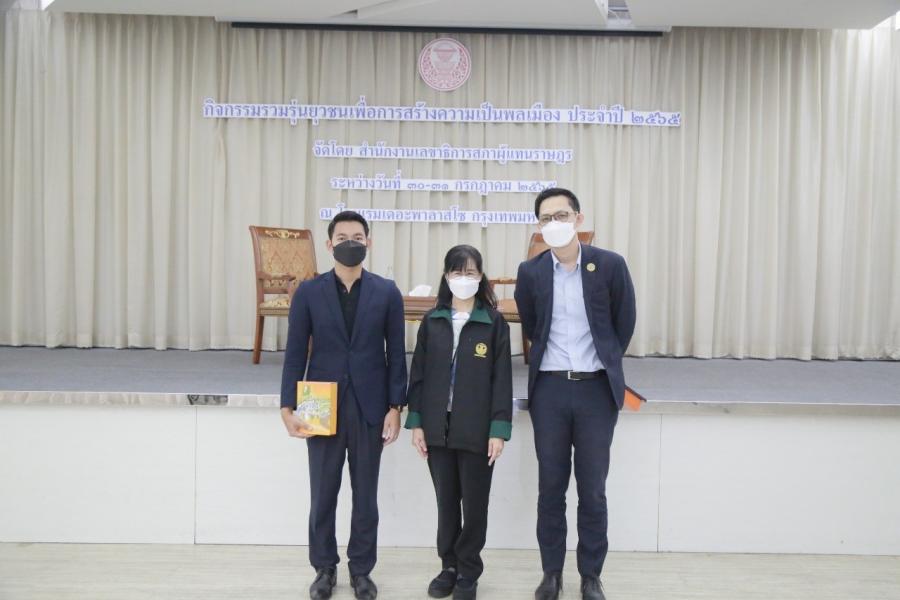วันอาทิตย์ที่ 31 กรกฎาคม 2565 เวลา 10.00 นาฬิกา ณ ห้องเออบิโน่ ชั้น 5 ตึกแกรนด์พาลาสโซ่ โรงแรมเดอะพาลาสโซ่ กรุงเทพฯ นายสิริพงศ์ อังคสกุลเกียรติ สมาชิกสภาผู้แทนราษฎร จังหวัดศรีสะเกษ พรรคภูมิใจไทย และนายจิรัฏฐ์ ทองสุวรรณ์ สมาชิกสภาผู้แทนราษฎร จังหวัดฉะเชิงเทรา พรรคก้าวไกล ร่วมเสวนา หัวข้อ "นโยบายแบบไหน...โดนใจเยาวชน" โครงการส่งเสริมและสนับสนุนความเป็นพลเมืองของเยาวชนในระบอบประชาธิปไตย เพื่อพัฒนาประชาธิปไตยให้ยั่งยืน กิจกรรมรวมรุ่นยุวชนเพื่อการสร้างความเป็นพลเมือง ประจำปี 2565 ดำเนินการเสวนา โดย นายธีร์วัฒน์ ชูรัตน์ ยุวชนประชาธิปไตย จังหวัดชุมพร ปี 2557  ผู้ประกาศข่าวสถานีโทรทัศน์ Thai PBS