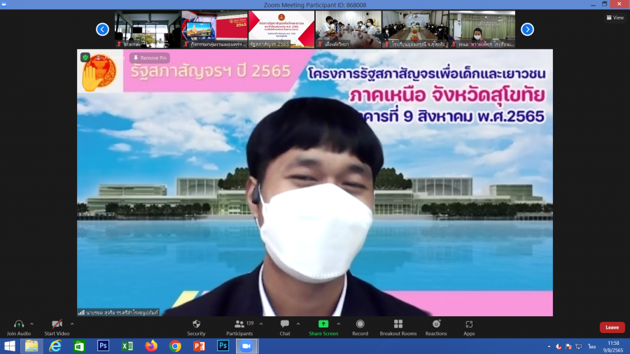 โครงการรัฐสภาสัญจรเพื่อเด็กและเยาวชน ประจำปี 2565 ผ่านสื่ออิเล็กทรอนิกส์ ภาคเหนือ จ.สุโขทัย เป็นการเสวนาเรื่อง บทบาทของเยาวชนกับการมีส่วนร่วมทางการเมืองในการพัฒนาประเทศให้ยั่งยืน
