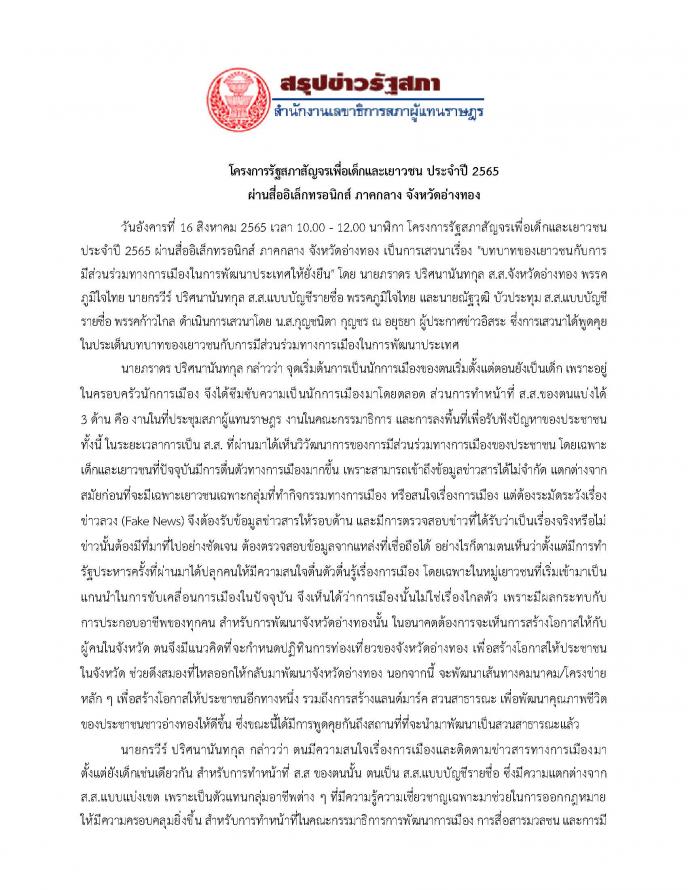 วันอังคารที่ 16 สิงหาคม 2565 เวลา 10.00 - 12.00 นาฬิกา โครงการรัฐสภาสัญจรเพื่อเด็กและเยาวชน ประจำปี 2565 ผ่านสื่ออิเล็กทรอนิกส์ ภาคกลาง จังหวัดอ่างทอง เป็นการเสวนาเรื่อง "บทบาทของเยาวชนกับการมีส่วนร่วมทางการเมืองในการพัฒนาประเทศให้ยั่งยืน" โดย นายภราดร ปริศนานันทกุล สมาชิกสภาผู้แทนราษฎรจังหวัดอ่างทอง พรรคภูมิใจไทย นายกรวีร์ ปริศนานันทกุล สมาชิกสภาผู้แทนราษฎรแบบบัญชีรายชื่อ พรรคภูมิใจไทย และนายณัฐวุฒิ บัวประทุม สมาชิกสภาผู้แทนราษฎรแบบบัญชีรายชื่อ พรรคก้าวไกล ดำเนินการเสวนา โดย น.ส.กุญชนิตา กุญชร ณ อยุธยา ผู้ประกาศข่าวอิสระ