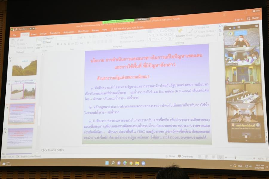 วันพฤหัสบดีที่ 25 สิงหาคม 2565 เวลา 09.30 นาฬิกา ณ ห้องประชุม CB 308 ชั้น 3 อาคารรัฐสภา นายมนูญ สิวาภิรมย์รัตน์ ประธานคณะ กมธ.ความมั่นคงแห่งรัฐ กิจการชายแดนไทย ยุทธศาสตร์ชาติและการปฏิรูปประเทศ เป็นประธานการประชุมคณะ กมธ. ครั้งที่ 94 เพื่อพิจารณาปัญหา เขตแดนและการปักปันเขตแดนบริเวณชายแดนระหว่างไทย เมียนมา และไทย ลาว