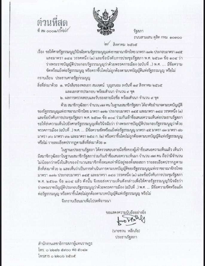 วันจันทร์ที่ 29 สิงหาคม 2565 เวลา 15.30 นาฬิกา นายอิสระ เสรีวัฒนวุฒิ สมาชิกสภาผู้แทนราษฎร พรรคประชาธิปัตย์ ในฐานะคณะทำงานของประธานรัฐสภา แถลงข่าวความคืบหน้าเพิ่มเติมร่าง พ.ร.ป.ว่าด้วยพรรคการเมือง ความว่า ตามที่ได้แถลงไว้ในช่วงเช้าวันนี้ กรณีการเข้าชื่อของพล.อ.สมเจตน์ บุญถนอมและคณะ ซึ่งเป็นสมาชิกวุฒิสภาอย่างเดียว จะตรงกับเงื่อนไขตามข้อบังคับรัฐสภา ข้อ 104 ประกอบ ข้อ 3 หรือไม่ ฝ่ายกฎหมายของสำนักงานเลขาธิการสภาผู้แทนราษฎร มีความเห็นว่า การตรวจสอบเรื่องนี้เกิดขึ้นเป็นครั้งแรกในรัฐสภาชุดนี้ ทำให้ยังไม่มีแนวทางคำวินิจฉัยของศาลรัฐธรรมนูญว่าเฉพาะ ส.ว. ถือว่าเข้าองค์ประกอบหรือไม่ จึงมีความเห็นให้ประธานรัฐสภาเสนอคำร้องดังกล่าวไปยังศาลรัฐธรรมนูญ พร้อมข้อสังเกตนี้และให้ศาลรัฐธรรมนูญเป็นผู้วินิจฉัย