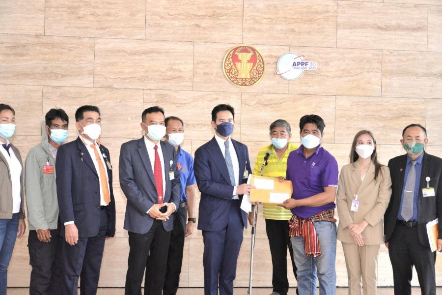 นายพิธา ลิ้มเจริญรัตน์ หัวหน้าพรรคก้าวไกล นายอภิชาติ ศิริสุนทร ประธานคณะ กมธ. การที่ดิน ทรัพยากรธรรมชาติและสิ่งแวดล้อม และคณะ รับยื่นหนังสือจาก นายเฉลิมวุฒิ วงษ์คำจันทร์ ตัวแทนประชาชนตำบลห้วยต้อนและตำบลท่าหินโงม จ.ชัยภูมิ เพื่อขอให้แก้ปัญหาความเดือดร้อนประชาชนในพื้นที่