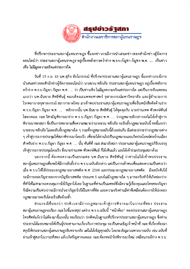 ที่ปรึกษาประธานสภาผู้แทนราษฎร ชี้แจงข่าวกรณีการนำเสนอข่าวของสำนักข่าวผู้จัดการออนไลน์ว่า นายชวน หลีกภัยประธานสภาผู้แทนราษฎร อยู่เบื้องหลังการคว่ำร่าง พ.ร.บ.กัญชา กัญชง พ.ศ. . เป็นข่าวเท็จ ไม่มีมูลความจริงแต่ประการใด