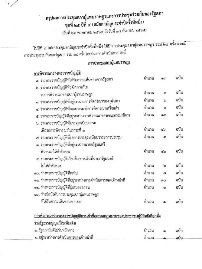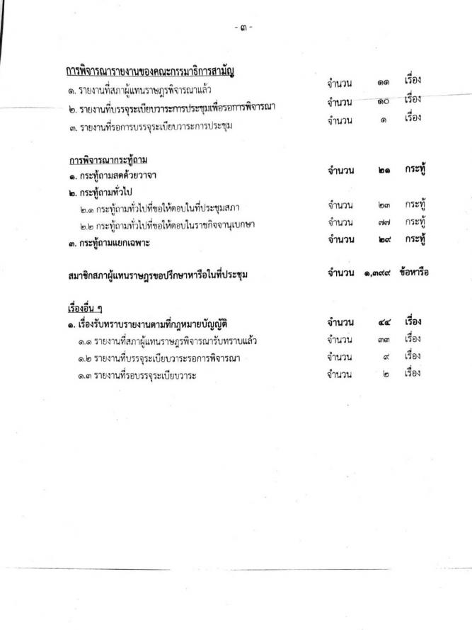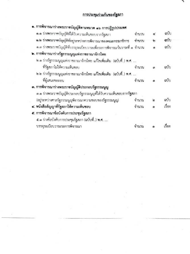 3) ร่างพระราชบัญญัติประกอบรัฐธรรมนูญ (พ.ร.ป.) ซึ่งถือว่าเป็นร่างกฎหมายที่ใช้เวลาในการพิจารณานานที่สุด มีประเด็นที่เป็นกล่าวขวัญกันอย่างมากมายจนในที่สุดร่าง พ.ร.ป. ทั้งสองฉบับ คือ ร่าง พ.ร.ป. ว่าด้วยพรรคการเมือง พ.ศ. .... และร่าง พ.ร.ป. ว่าด้วยการเลือกตั้งสมาชิกสภาผู้แทนราษฎร พ.ศ. .... ได้รับความเห็นชอบจากรัฐสภาไปเป็นที่เรียบร้อยแล้ว แม้ว่าจะผ่านรัฐสภาไปแล้วแต่ยังไม่ประกาศใช้เป็นกฎหมายเนื่องจากมีผู้ร้องศาลรัฐธรรมนูญให้ตรวจสอบว่ามีข้อความที่ขัดหรือแย้งกับรัฐธรรมนูญหรือไม่ หรือวิธีการออกกฎหมายขัดต่อบทบัญญัติในรัฐธรรมนูญหรือไม่ยังคงต้องรอว่าศาลรัฐธรรมนูญจะตัดสินว่าอย่างไร สุดท้ายคือร่างแก้ไขรัฐธรรมนูญ ซึ่งเสนอโดยพรรคฝ่ายค้านและจากภาคประชาชน ซึ่งก็ผ่านการพิจารณาไปเป็นที่เรียบร้อยแล้ว ตอนนี้ยังมีร่างพระราชบัญญัติที่ได้รับความเห็นชอบจากรัฐสภาไปแล้วจำนวน 13 ฉบับ ญัตติที่สภามีมติส่งรัฐบาลดำเนินการ จำนวน 3 เรื่อง รวม 12 ญัตติ รายงานของคณะกรรมาธิการสามัญที่สภาผู้แทนราษฎรพิจารณาแล้วจำนวน 11 เรื่อง มีการพิจารณากระทู้ถามสดด้วยวาจาจำนวน 21 กระทู้ กระทู้ถามทั่วไป ซึ่งแบ่งเป็นกระทู้ถามทั่วไปที่ขอให้ตอบในที่ประชุมสภาจำนวน 23 กระทู้ และกระทู้ถามทั่วไปที่ขอให้ตอบในราชกิจจานุเบกษาจำนวน 77 กระทู้ กระทู้ถามแยกเฉพาะจำนวน 29 กระทู้ และสมาชิกสภาผู้แทนราษฎรขอปรึกษาหารือในที่ประชุมจำนวน 1,399 ข้อหารือ (รายละเอียดตามแนบ)