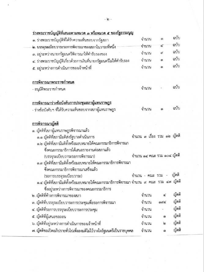 2) ญัตติขอเปิดอภิปรายไม่ไว้วางใจรัฐมนตรีเป็นรายบุคคลรวมทั้งนายกรัฐมนตรี ผ่านการพิจารณาไปเรียบร้อยในสมัยประชุมนี้