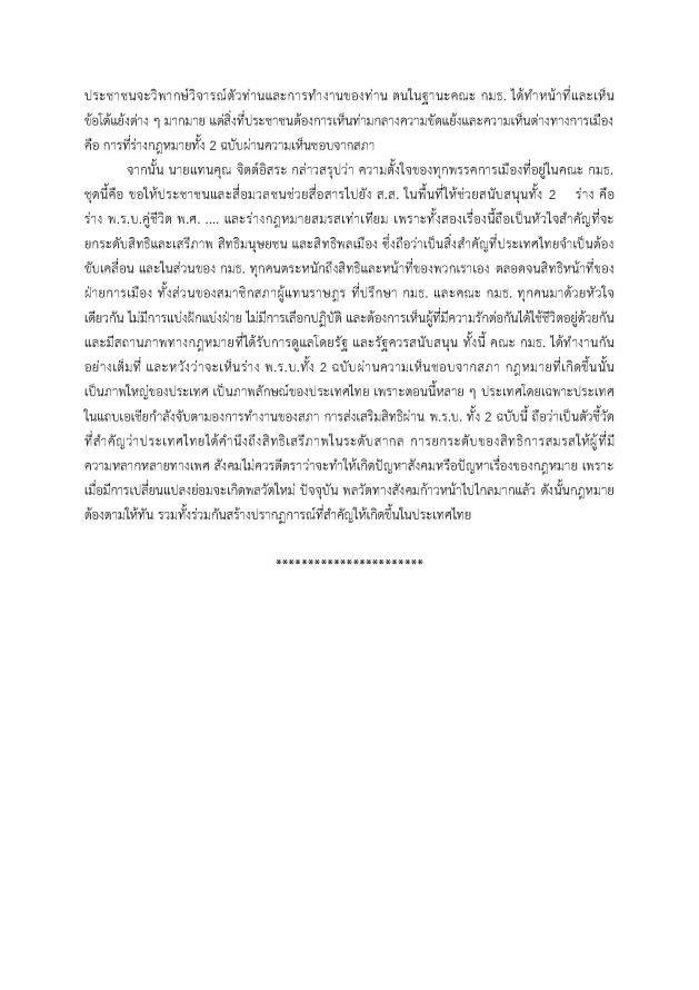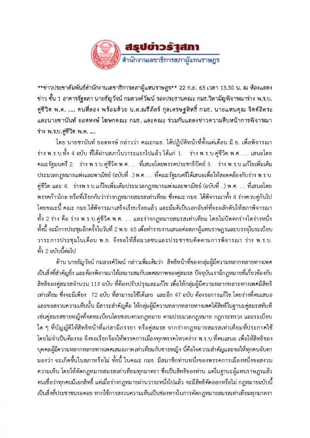 วันพฤหัสบดีที่ 22 กันยายน 2565 เวลา 13.30 นาฬิกา ณ ห้องแถลงข่าว ชั้น 1 อาคารรัฐสภา นายธัญวัจน์ กมลวงศ์วัฒน์ รองประธานคณะ กมธ.วิสามัญพิจารณาร่าง พ.ร.บ.คู่ชีวิต พ.ศ. .... คนที่สอง พร้อมด้วย น.ส.ณธีภัสร์ กุลเศรษฐสิทธิ์ กมธ. นายแทนคุณ จิตต์อิสระ และนายชานันท์ ยอดหงษ์ โฆษกคณะ กมธ. และคณะ ร่วมกันแถลงข่าวความคืบหน้าการพิจารณาร่าง พ.ร.บ.คู่ชีวิต พ.ศ. .... (รายละเอียดตามเอกสารที่แนบ)