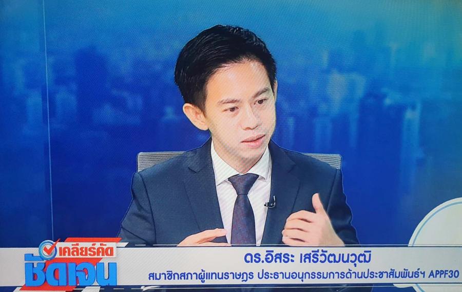 วันอังคารที่ 25 ตุลาคม 2565 เวลา 16.50 นาฬิกา ณ สถานีโทรทัศน์แห่งประเทศไทย (สทท.) นายอิสระ เสรีวัฒนวุฒิ สมาชิกสภาผู้แทนราษฎร และประธานคณะอนุกรรมการด้านการประชาสัมพันธ์และสารสนเทศการประชุม บันทึกเทปรายการ เคลียร์คัด ชัดเจน ทางสถานีโทรทัศน์แห่งประเทศไทย (สทท.) เพื่อประชาสัมพันธ์การประชุมประจำปีรัฐสภาภาคพื้นเอเชียและแปซิฟิก ครั้งที่ 30 ( APPF 30) โดยนำเสนอเนื้อหาเกี่ยวกับการเตรียมการจัดการประชุม และความพร้อมของประเทศไทยในการเป็นเจ้าภาพจัดการประชุม หัวข้อหลักและหัวข้อย่อยในการประชุม ตลอดจนประโยชน์ที่ประเทศไทย และประเทศภูมิภาคจะได้รับจากการประชุมในครั้งนี้ ทั้งนี้ รายการดังกล่าวจะออกอากาศในวันพรุ่งนี้ (26 ต.ค. 65) เวลา 15.05 - 15.45 น. สามารถติดตามรับชมก่อนการถ่ายทอดสดพิธีเปิดการประชุมทางสถานีโทรทัศน์แห่งประเทศไทย ช่องหมายเลข 2 และจะออกอากาศทางสถานีโทรทัศน์รัฐสภา ช่องหมายเลข 10 เวลา 17.00 - 18.00 น.