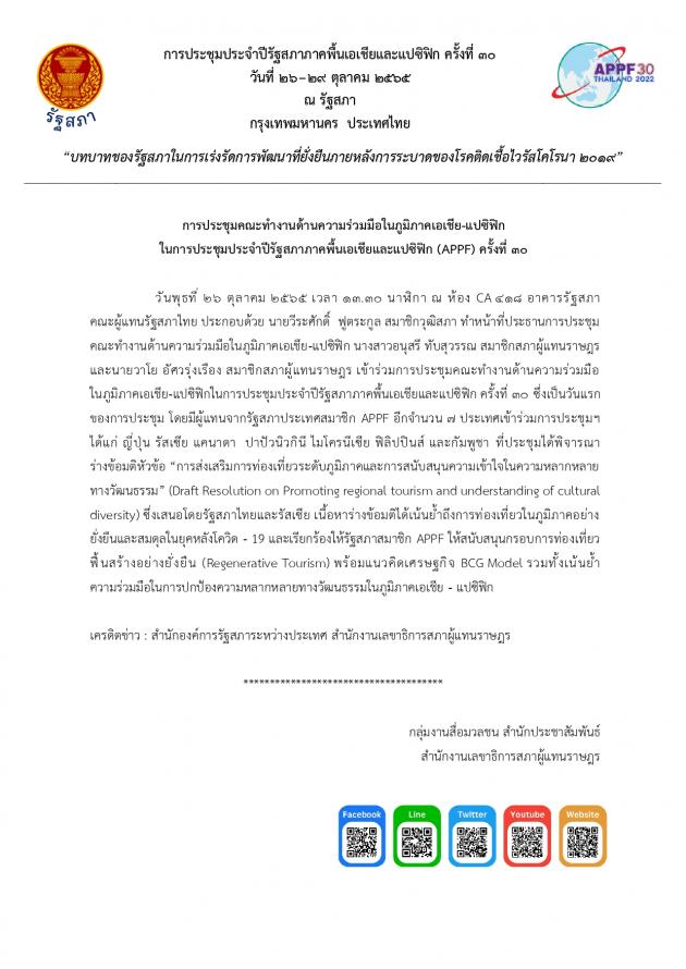 วันพุธที่ 26 ตุลาคม 2565 เวลา 13.30 นาฬิกา ณ ห้องประชุม CA 418 ชั้น 4 อาคารรัฐสภา นายวีระศักดิ์ ฟูตระกูล สมาชิกวุฒิสภา เป็นประธานการประชุมคณะทำงานด้านความร่วมมือในภูมิภาคเอเชีย-แปซิฟิก