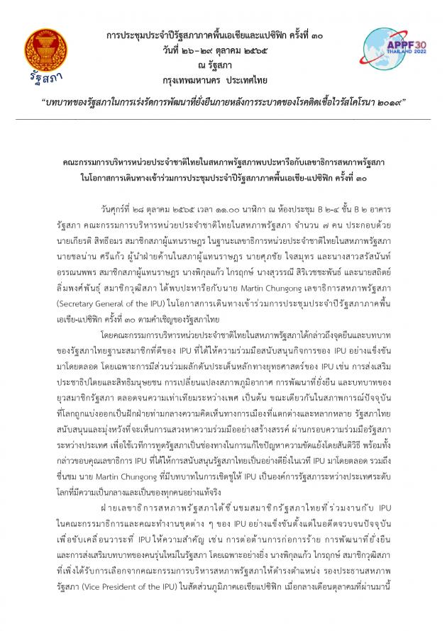 เมื่อวันที่ 28 ตุลาคม 2565 เวลา 11.00 นาฬิกา ณ ห้องประชุม B 2-4 ชั้น B 2 อาคารรัฐสภา คณะกรรมการบริหารหน่วยประจำชาติไทยในสหภาพรัฐสภา จำนวน 7 คน ประกอบด้วย นายเกียรติ สิทธีอมร สมาชิกสภาผู้แทนราษฎร ในฐานะเลขาธิการหน่วยประจำชาติไทยในสหภาพรัฐสภา นายชลน่าน ศรีแก้ว ผู้นำฝ่ายค้านในสภาผู้แทนราษฎร นายศุภชัย ใจสมุทร และนางสาวสรัสนันท์ อรรณนพพร สมาชิกสภาผู้แทนราษฎร นางพิกุลแก้ว ไกรฤกษ์ นางสุวรรณี สิริเวชชะพันธ์ และนายสถิตย์ ลิ่มพงศ์พันธุ์ สมาชิกวุฒิสภา พบปะหารือกับนาย Martin Chungong เลขาธิการสหภาพรัฐสภา (Secretary General of the IPU) ในโอกาสเดินทางเข้าร่วมการประชุมประจำปีรัฐสภาภาคพื้นเอเชีย-แปซิฟิก ครั้งที่ 30 ตามคำเชิญของรัฐสภาไทย