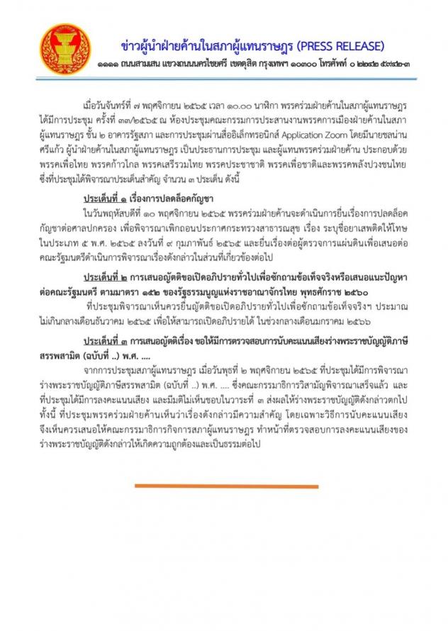 ประชุมพรรคร่วมฝ่ายค้านในสภาผู้แทนราษฎร ครั้งที่ 33/2565 ผ่านสื่ออิเล็กทรอนิกส์