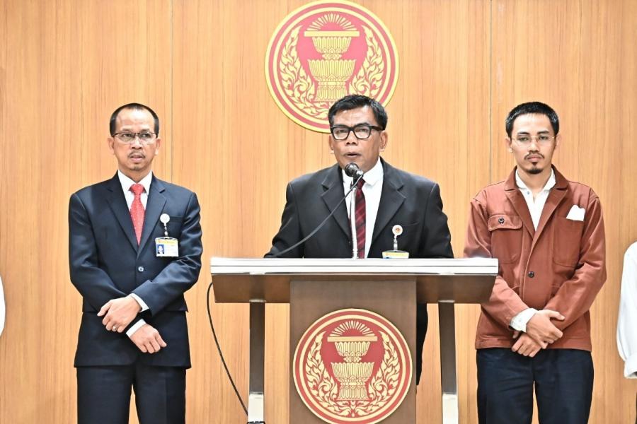 นายอาดิลัน อาลีอิสเฮาะ กมธ.การกฎหมาย การยุติธรรมและสิทธิมนุษยชน นายกมลศักดิ์ ลีวาเมาะ เลขานุการคณะกมธ. และคณะ แถลงข่าวผลการประชุมของคณะ กมธ.