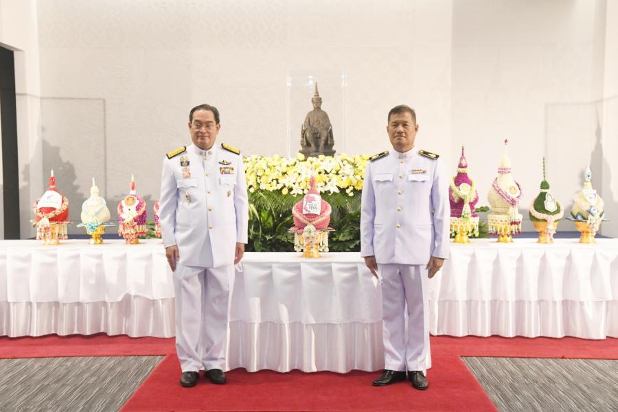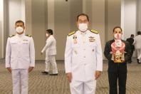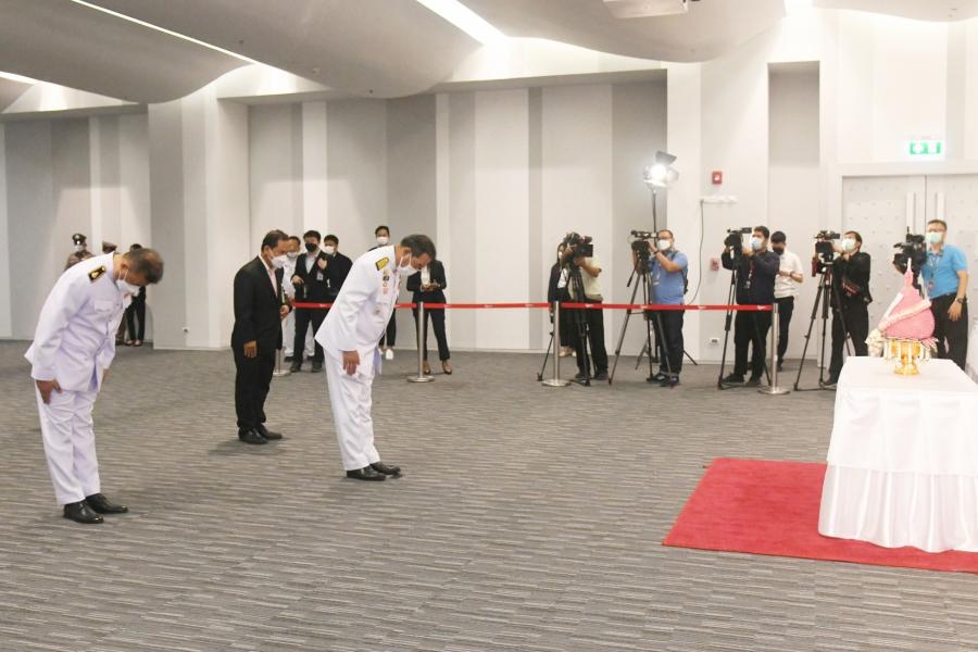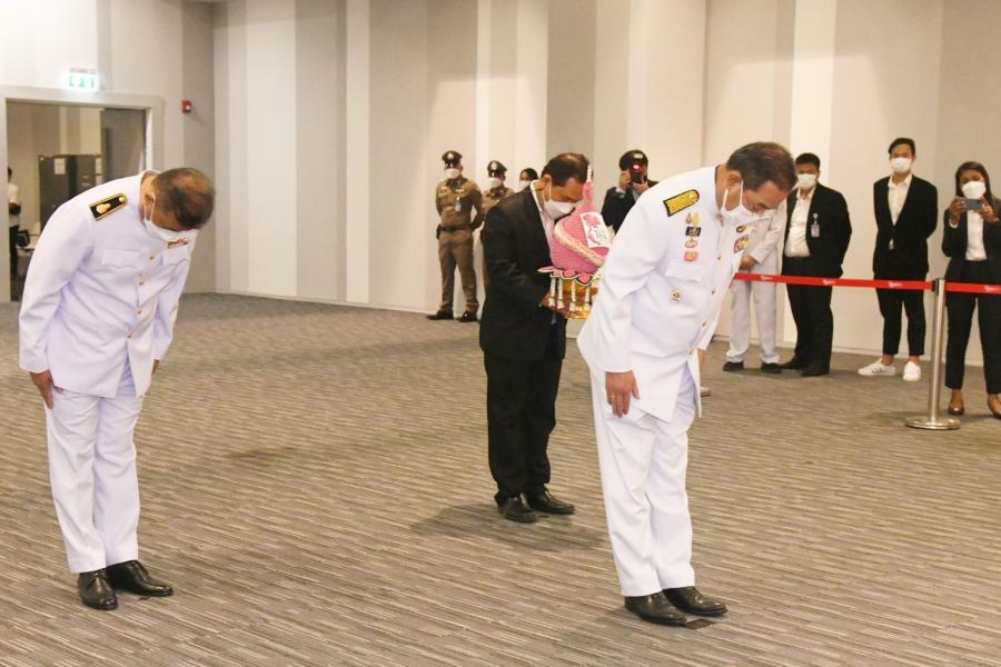 นายนิกร จำนง สมาชิกสภาผู้แทนราษฎร พรรคชาติไทยพัฒนา วางพานประดับพุ่มดอกไม้ถวายบังคมพระรูปต้นแบบพระบาทสมเด็จพระปกเกล้าเจ้าอยู่หัว ในนาม พรรคชาติไทยพัฒนา