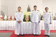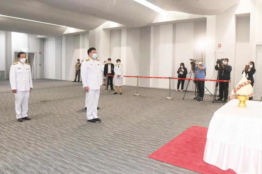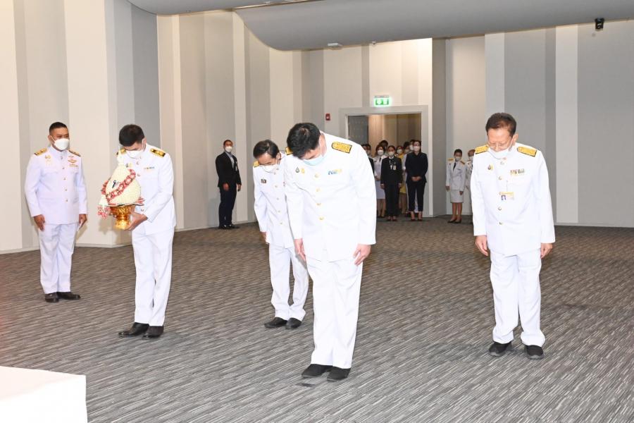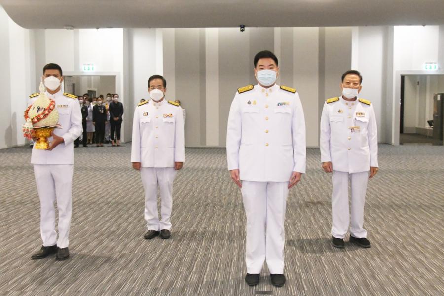 นายศรัณย์ ทิมสุวรรณ นายศิรสิทธิ์ เลิศด้วยลาภ และวีระวัฒน์ โอสถานุเคราะห์ สมาชิกสภาผู้แทนราษฎร พรรคเพื่อไทย วางพานประดับพุ่มดอกไม้ถวายบังคมพระรูปต้นแบบพระบาทสมเด็จพระปกเกล้าเจ้าอยู่หัว ในนาม พรรคเพื่อไทย