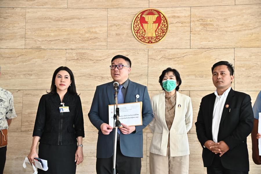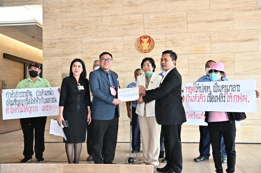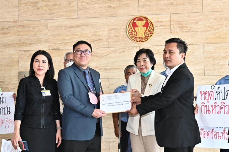 นายจุลพันธ์ อมรวิวัฒน์ และนางสุภาภรณ์ คงวุฒิปัญญา ส.ส.พรรคเพื่อไทย รับยื่นหนังสือเรียน นายชลน่าน ศรีแก้ว ผู้นำฝ่ายค้านในสภาผู้แทนราษฎรและหัวหน้าพรรคเพื่อไทย จาก นายวรพล แกมขุนทด ประธานที่ปรึกษาสมาคมวิชาชีพผู้ขับขี่รถยนต์สาธารณะแท็กซี่ และ พ.ท.พญ.กมลพรรณ ชีวพันธ์ศรี เลขาธิการเครือข่ายประชาชนปกป้องประเทศ และคณะ