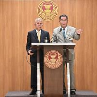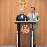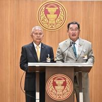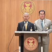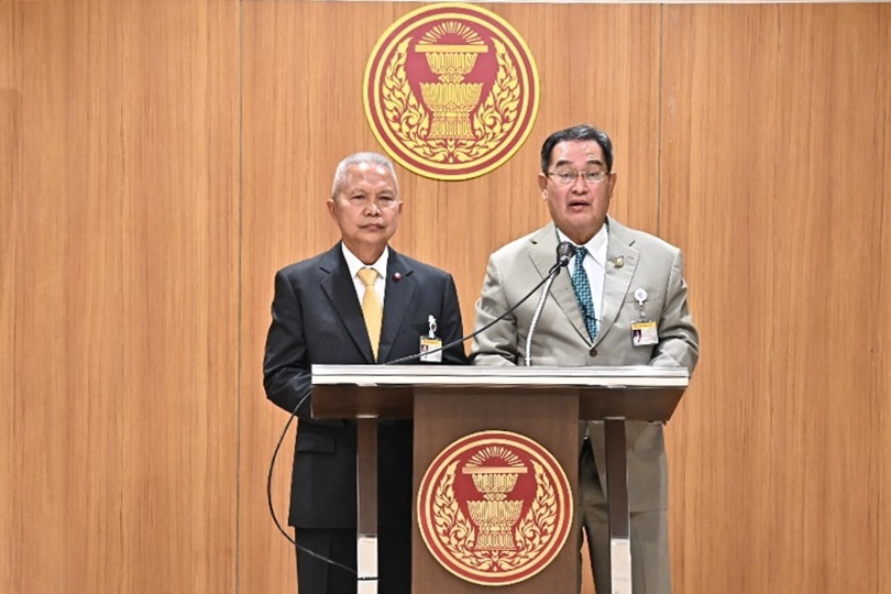 นายโสภณ ซารัมย์ ประธานคณะกมธ. การคมนาคม พร้อมด้วยนายนิกร จำนง รองประธานคณะ กมธ.การคมนาคม คนที่ห้า ร่วมกันแถลงข่าวผลการประชุมคณะ กมธ.