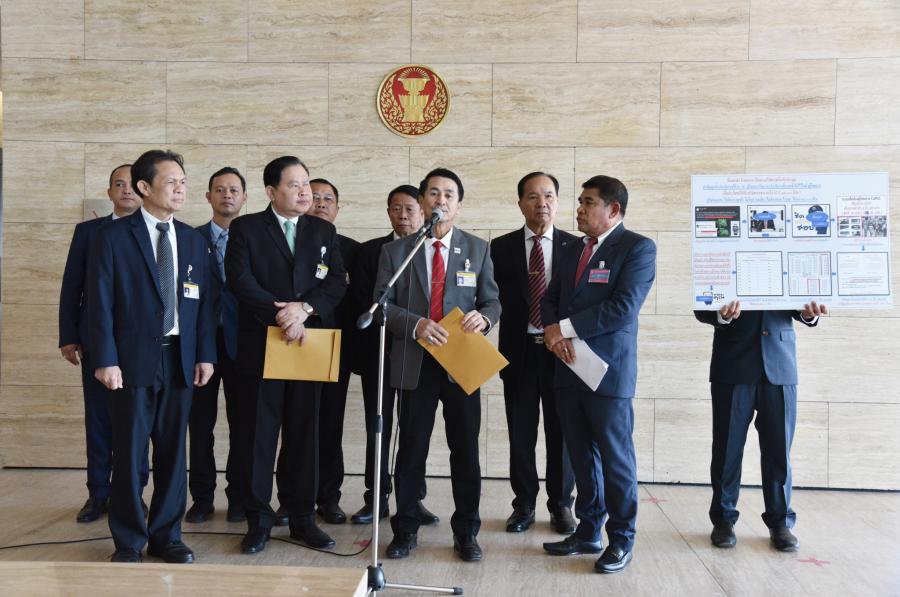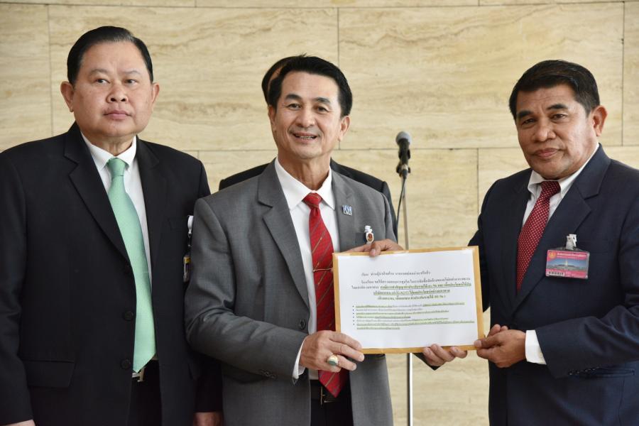 นายชลน่าน ศรีแก้ว ผู้นำฝ่ายค้านในสภาผู้แทนราษฎรและหัวหน้าพรรคเพื่อไทย และนายไชยา พรหมา ประธานคณะ กมธ.ศึกษา การจัดทำและติดตามการบริหารงบประมาณ พร้อมด้วย ส.ส.พรรคเพื่อไทย รับยื่นหนังสือจาก นายยศวริศ ชูกล่อม