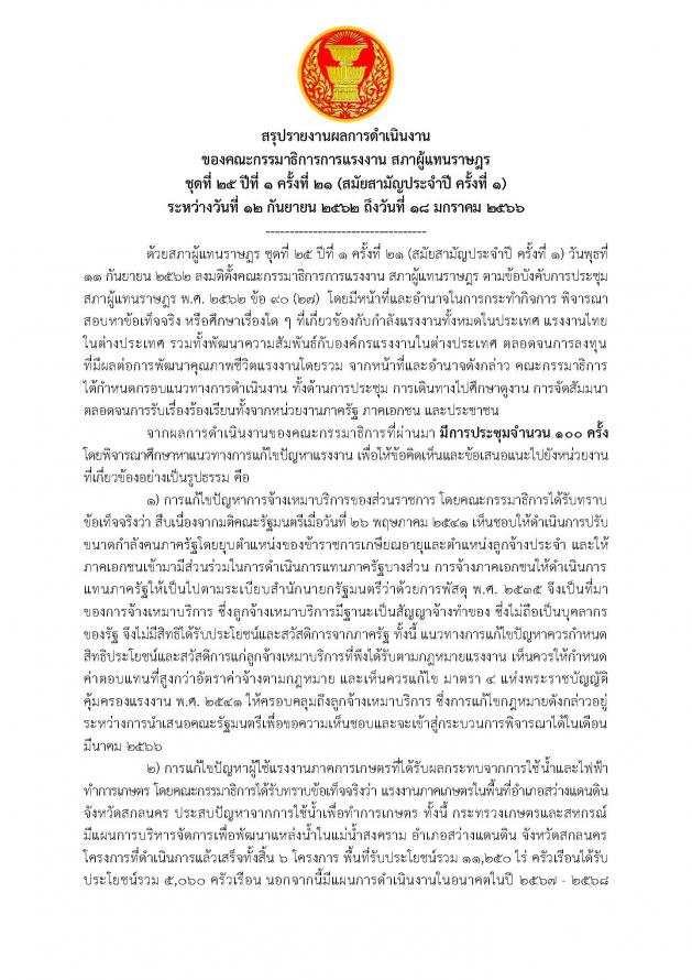 วันพุธที่ 18 มกราคม 2566 เวลา 11.15 นาฬิกา ณ จุดรับยื่นหนังสือ ชั้น 1 (โซนกลาง) อาคารรัฐสภา นายสุเทพ อู่อ้น ประธานคณะกรรมาธิการการแรงงาน แถลงข่าวสรุปรายงานผลการดำเนินงานของคณะกรรมาธิการการแรงงานว่าด้วยสภาผู้แทนราษฎร ชุดที่ 25 ปีที่ 1 ครั้งที่ 21 (สมัยสามัญประจำปี ครั้งที่หนึ่ง) วันพุธที่ 11 กันยายน 2562 ลงมติตั้งคณะกรรมาธิการการแรงงาน ตามข้อบังคับการประชุมสภาผู้แทนราษฎร พ.ศ. 2562 ข้อ 90 (27) โดยมีหน้าที่และอำนาจในการกระทำกิจการ พิจารณาสอบหาข้อเท็จจริง หรือศึกษาเรื่องใด ที่เกี่ยวข้องกับแรงงานทั้งหมดในประเทศและต่างประเทศ รวมทั้งพัฒนาความสัมพันธ์กับองค์กรแรงงานในต่างประเทศที่มีผลต่อการพัฒนาคุณภาพชีวิตแรงงานโดยรวม จากหน้าที่และอำนาจดังกล่าว คณะกรรมาธิการได้กำหนดกรอบแนวทางการดำเนินงาน ทั้งด้านการประชุม การเดินทางไปศึกษาดูงาน การจัดสัมมนาตลอดจนการรับเรื่องร้องเรียนทั้งจากหน่วยงานภาครัฐ ภาคเอกชน และประชาชน