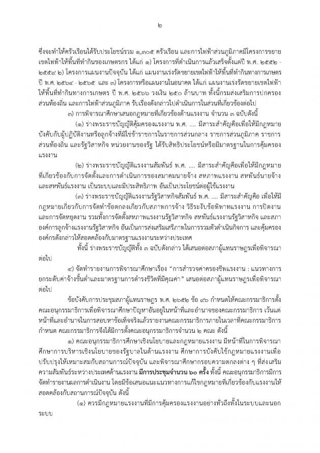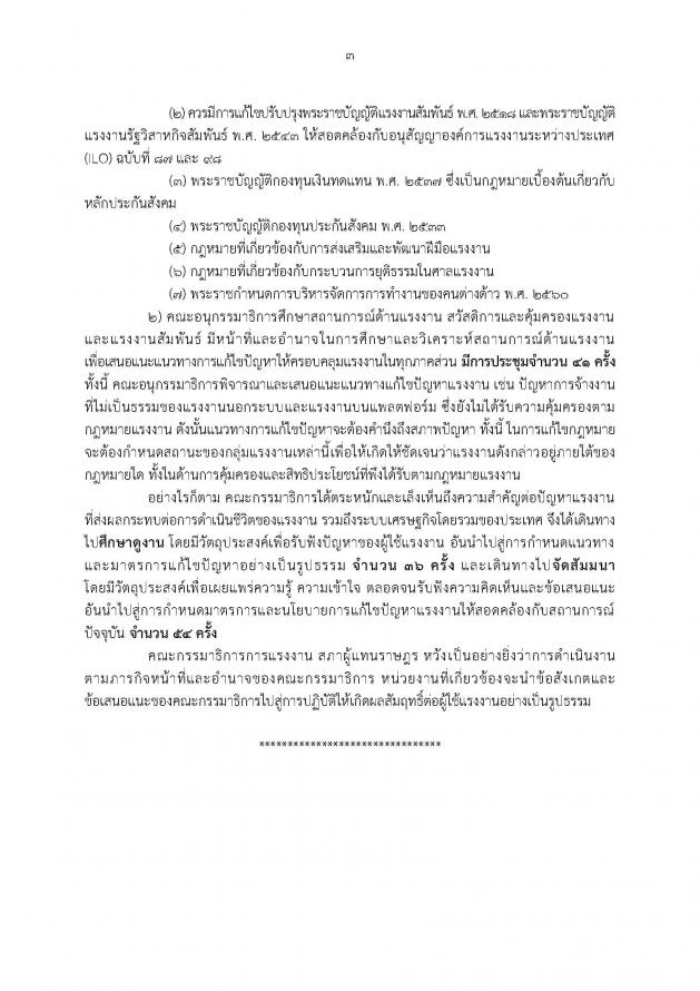 จากผลการดำเนินงานของคณะกรรมาธิการที่ผ่านมา มีการประชุมจำนวน 100 ครั้ง โดยพิจารณาศึกษาหาแนวทางการแก้ไขปัญหาแรงาน เพื่อให้ข้อคิดเห็นและข้อเสนอแนะไปยังหน่วยงาน ที่เกี่ยวข้องอย่างเป็นรูปธรรม (รายละเอียดตามเอกสารแนบ)