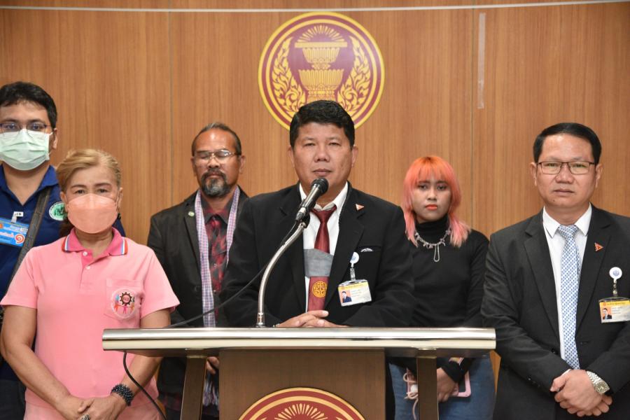 ประธานคณะ กมธ.การแรงงาน พร้อมด้วย นายจรัส คุ้มไข่น้ำ เลขานุการคณะ กมธ. และตัวแทนผู้ค้าหาบเร่แผงลอยในพื้นที่กรุงเทพมหานคร แถลงข่าว