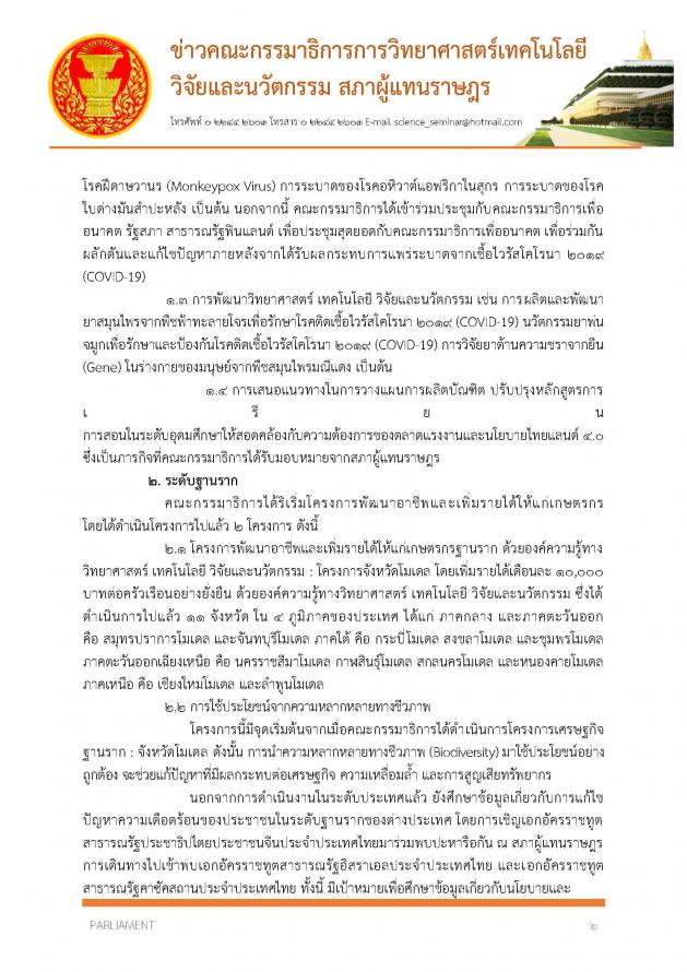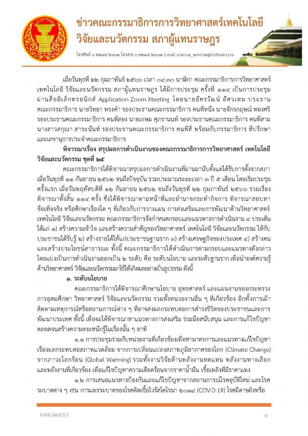 วันพฤหัสบดีที่ 23 กุมภาพันธ์ 2566 เวลา 11.40 นาฬิกา ณ ห้องแถลงข่าว ชั้น 1 อาคารรัฐสภา นายอัครวัฒน์ อัศวเหม ประธานคณะ กมธ.การวิทยาศาสตร์ เทคโนโลยี วิจัยและนวัตกรรม และคณะ แถลงข่าวสรุปผลการดำเนินงานของคณะ กมธ. นับตั้งแต่ได้รับการตั้งจากสภาผู้แทนราษฎร เมื่อวันที่ 11 ก.ย. 62 จนถึงปัจจุบัน รวมระยะเวลา 3 ปี 5 เดือน โดยเริ่มประชุมครั้งแรกเมื่อวันที่ 12 ก.ย. 62 ถึงวันที่ 22 ก.พ. 66 รวมเรื่องพิจารณาทั้งสิ้น 114 เรื่อง มีกรอบและแนวทางการดำเนินงาน 4 ประเด็น ได้แก่ 1) สร้างความเข้าใจและความสำคัญของวิทยาศาสตร์ เทคโนโลยี วิจัยและนวัตกรรม ให้แก่ประชาชน 2) สร้างรายได้ให้แก่ประชาชนฐานราก 3) สร้างเศรษฐกิจของประเทศ และ 4) สร้างคนและสร้างประโยชน์สาธารณะ โดยแบ่งการดำเนินงานออกเป็น 2 ระดับ คือ ระดับนโยบาย และระดับฐานราก เพื่อนำองค์ความรู้ด้านวิทยาศาสตร์ วิจัยและนวัตกรรม มาใช้ให้เกิดผลอย่างเป็นรูปธรรม
