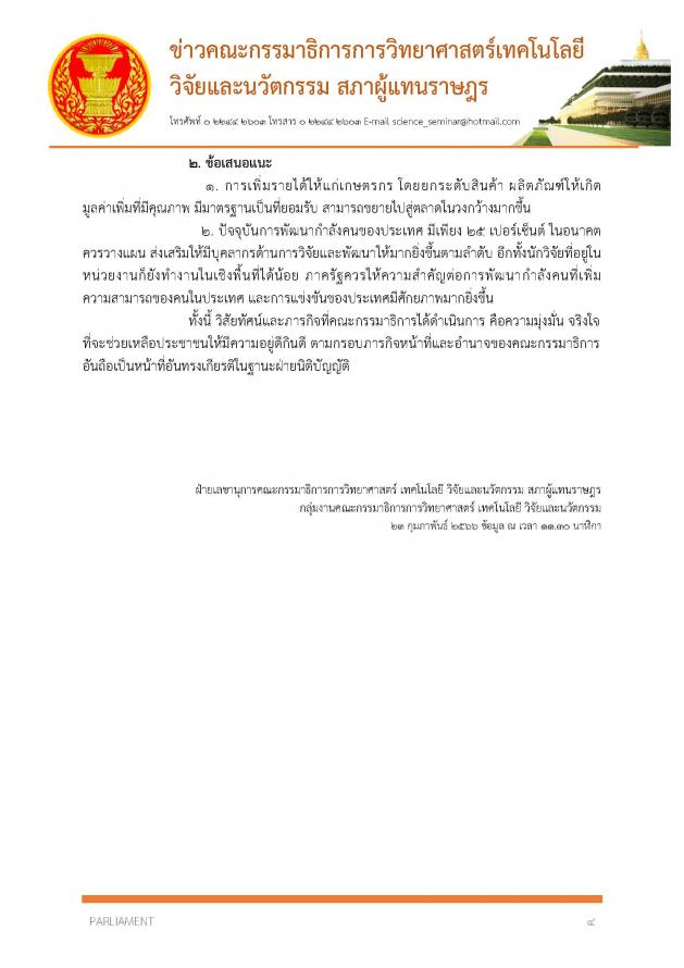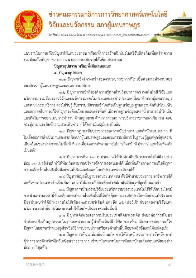 ทั้งนี้ จากการพิจารณาพบปัญหาอุปสรรคต่าง ๆ อาทิ ปัญหาเชิงโครงสร้างของระบบราชการ กฎ ระเบียบราชการของกรมบัญชีกลางและสำนักงบประมาณ ที่ไม่เอื้อต่อการทำงานของ ส.ส. และคณะ กมธ. ปัญหาการเข้าถึงองค์ความรู้ทางด้านวิทยาศาสตร์ เทคโนโลนี วิจัยและนวัตกรรม ปัญหาการพิจารณางบประมาณให้กับท้องถิ่น และปัญหาการนำผลงานวิจัยและนวัตกรรมของประเทศไปใช้ให้เกิดประโยชน์ ซึ่งคณะ กมธ. มีข้อเสนอแนะ อาทิ การเพิ่มรายได้ให้แก่เกษตรกร โดยยกระดับสินค้า ผลิตภัณฑ์ ให้เกิดมูลค่าเพิ่มที่มีคุณภาพ มีมาตรฐานเป็นที่ยอมรับ และควรวางแผน ส่งเสริมให้มีบุคลากรด้านการวิจัยและพัฒนาให้มากยิ่งขึ้น (รายละเอียดตามเอกสารแนบ)
