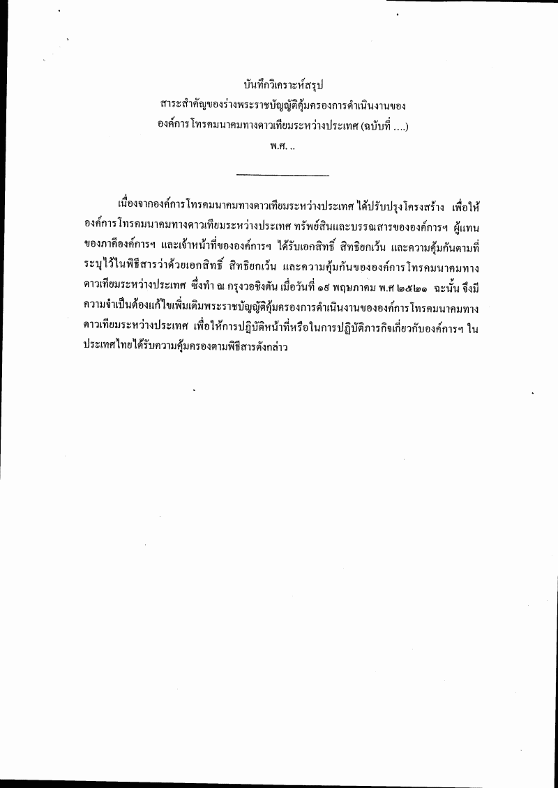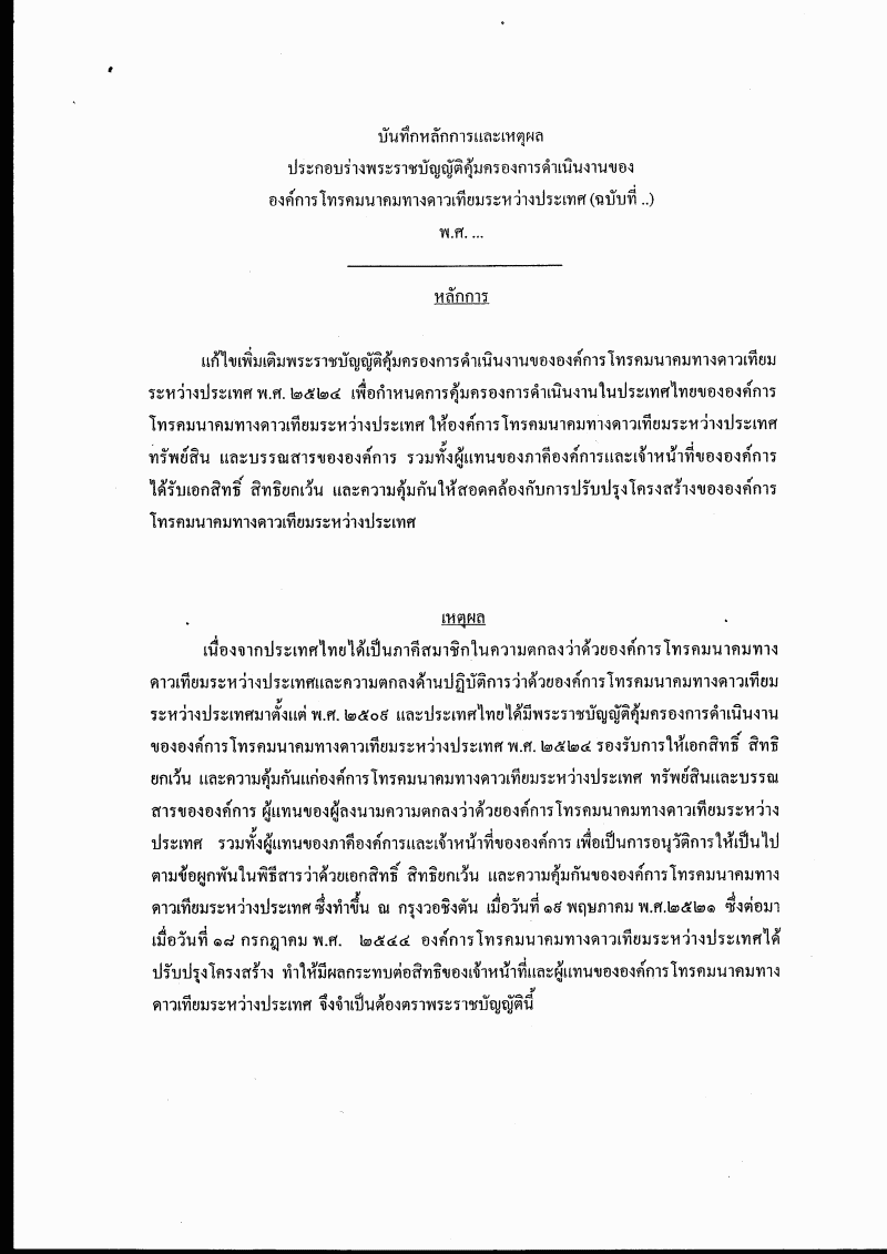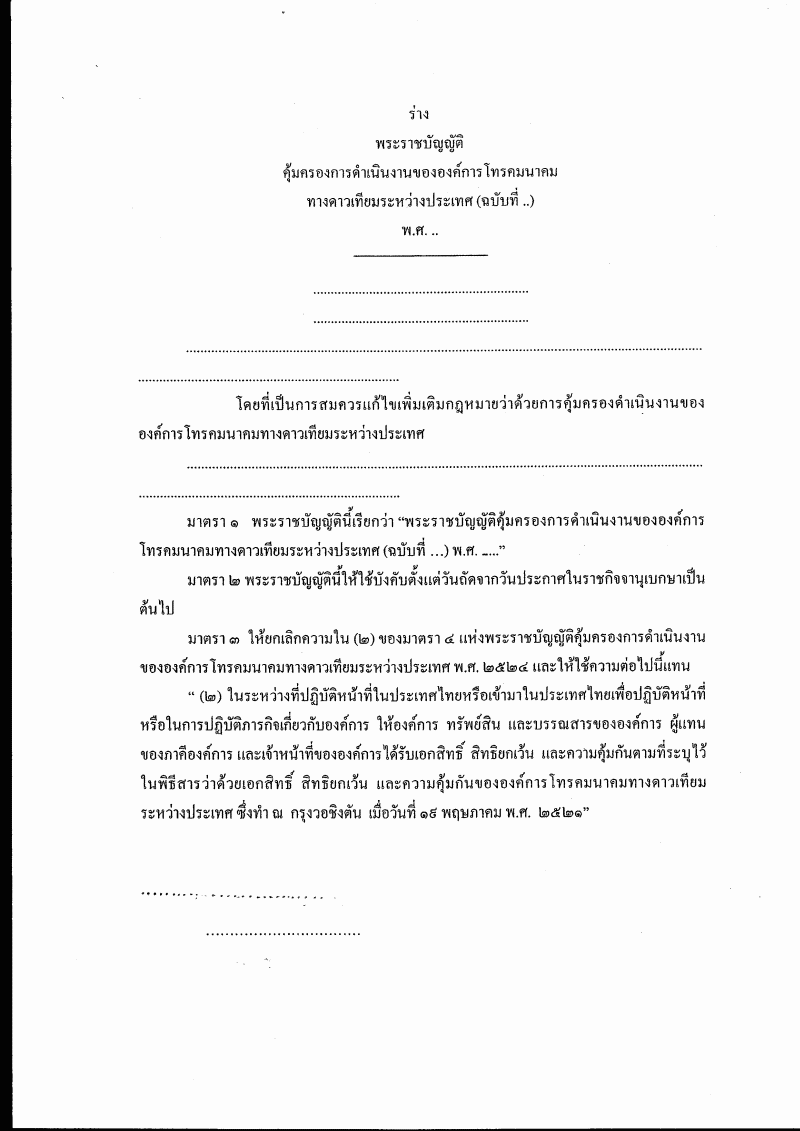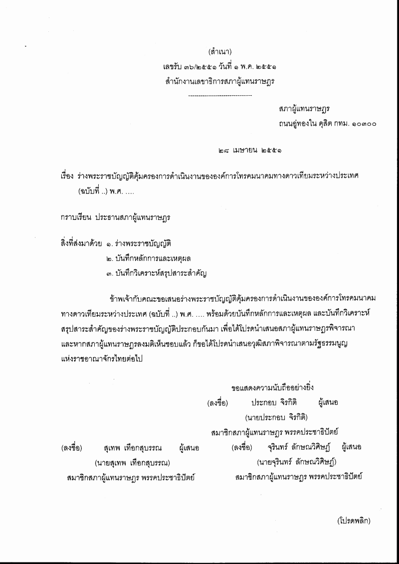 | ชื่อเอกสาร : (3) ร่างพระราชบัญญัติคุ้มครองการดำเนินงานขององค์การโทรคมนาคมทางดาวเทียมระหว่างประเทศ (ฉบับที่ ..) พ.ศ. .... (นายประกอบ จิรกิติ กับคณะ เป็นผู้เสนอ) |