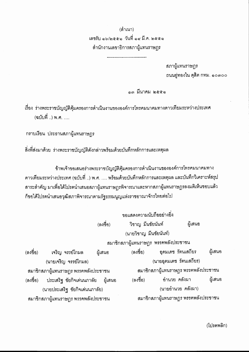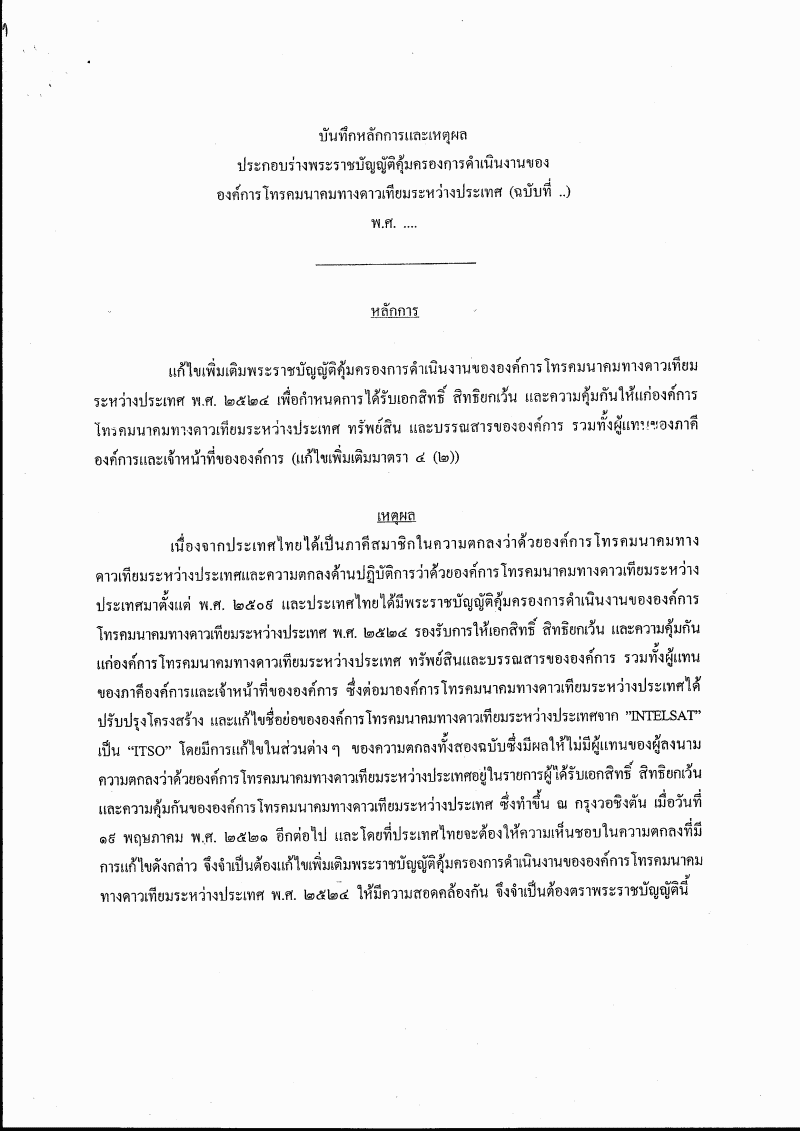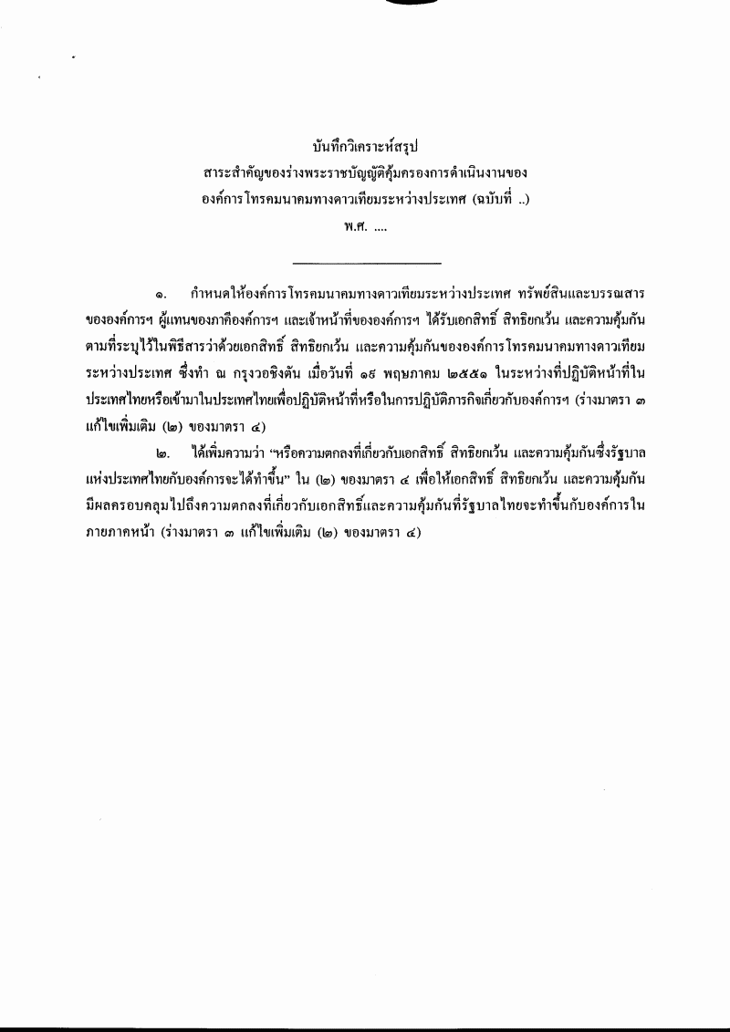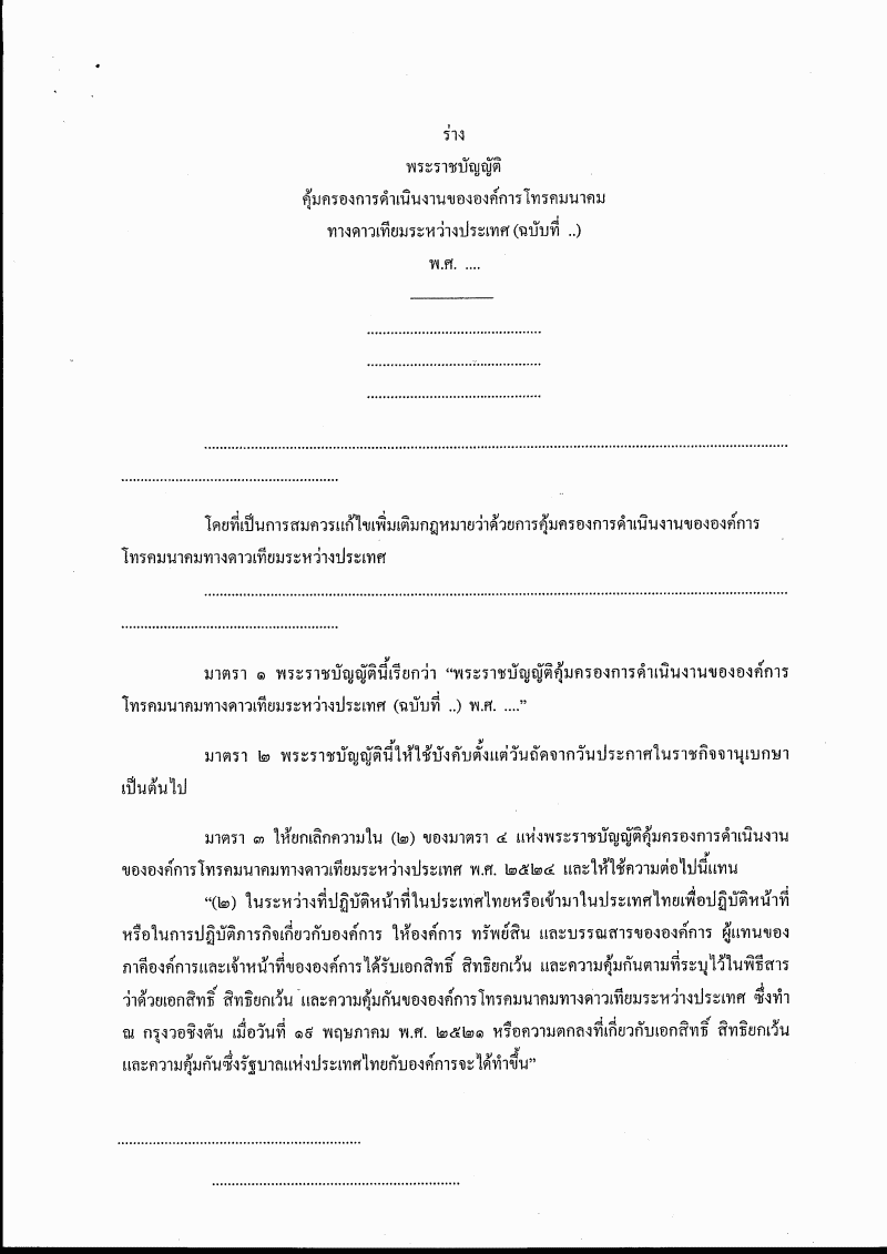 ร่างพระราชบัญญัติคุ้มครองการดำเนินงานขององค์การโทรคมนาคมทางดาวเทียมระหว่างประเทศ (ฉบับที่ ..) พ.ศ. .... (นายวิชาญ มีนชัยนันท์ กับคณะ เป็นผู้เสนอ) (เวอร์ชั่นที่ 1) |