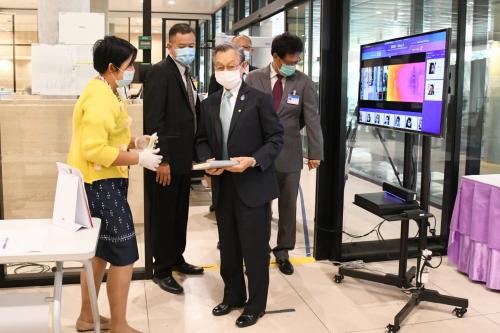 ตรวจวัดอุณหภูมิร่างกายก่อนเข้าภายในอาคารรัฐสภา ซึ่งเป็นไปตามแนวปฏิบัติเพื่อป้องกันการแพร่ระบาดของเชื้อไวรัสโคโรนา ๒๐๑๙ หรือโรคโควิด-๑๙ ณ อาคารรัฐสภา เกียกกาย ของสำนักงานเลขาธิการสภาผู้แทนราษฎร