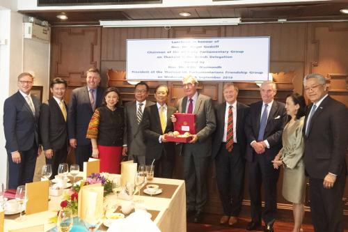 ประธานกลุ่มมิตรภาพสมาชิกรัฐสภาไทย-สหราชอาณาจักรฯ พร้อมด้วยคณะกรรมการบริหาร กลุ่มมิตรภาพฯ เป็นเจ้าภาพเลี้ยงรับรอง เพื่อเป็นเกียรติแก่สมาชิกสภาสามัญพรรคแรงงานและ ประธานกลุ่มมิตรภาพรัฐสภาสหราชอาณาจักรฯ - ไทย